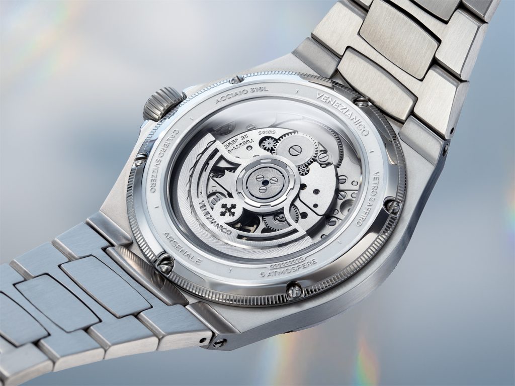Arsenale è uno dei modelli più iconici di Venezianico, già noto per la sua forza sobria e la sua struttura solida ma raffinata. Nella versione Platino, però, accade qualcosa di più sottile: il design si fa quasi architettonico, come se cercasse di riflettere la complessità del cantiere industriale che fu cuore pulsante della Serenissima. Non è solo ispirazione, è traslazione: quell’antico luogo dove si costruivano navi e futuro diventa un orologio, e il gesto tecnico si fa poesia visiva.